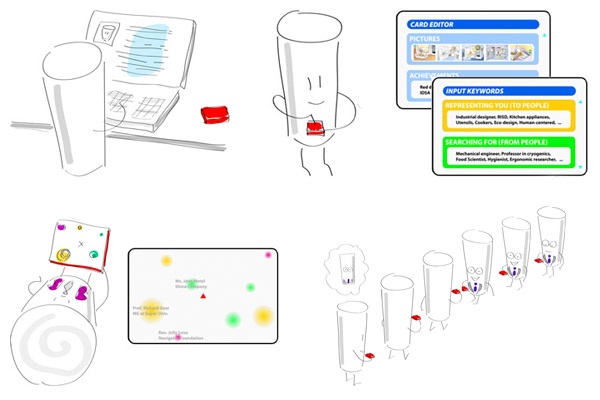 Card manager makes social networking easy and handy. Key words describing a user's career, business and interests are stored in the device and discoverable by other users nearby. Locations of people interested in my key words as well as having corresponding ones that I am looking for are displayed on the screen. Intuitive sliding motions are used to give and receive cards, retaining the essence of the ritual. Collected personal contacts are kept up-to-date through network.