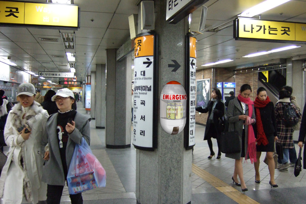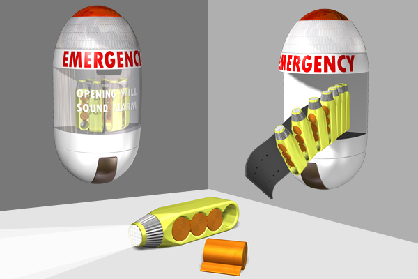 Escape Guide is a unified rescue system, which saves people in public spaces by light, sound, and gas masks. When a fire detected, the wall mount facility illuminates the space, makes alarm, and releases self-generating flashlights, which hold several gas masks. It also projects a pathway to an exit on the floor to make people bend down and escape safely. Therefore some people take the flashlights first, then distribute the gas masks to others nearby and lead the groups to the exit.