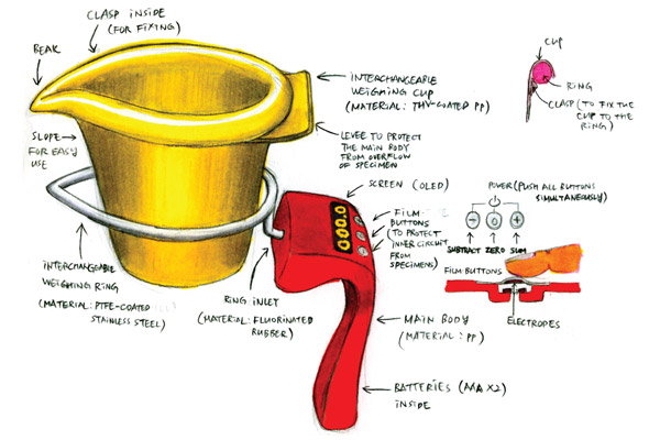 Responding to the researchers' needs, the industrial scale transformed the repetitious and mistakable job to a dynamic and systematic scooping. The ergonomic form of main body provides a comfortable grip, and its functions adding or subtracting individual weights enable efficient work. Cups and rings in diverse sizes also enhance usability of the scale.