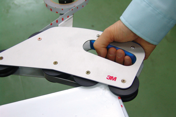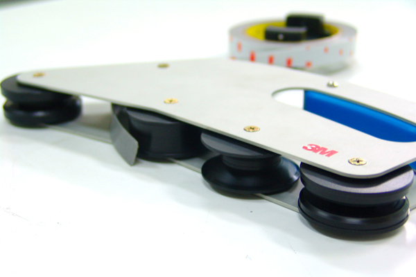 I designed a tape applicator to eliminate the bottleneck and raise the productivity. Made of ultra light aluminum and equipped with grooved wheels, it empowers the workers to finish perfect taping even with a hand, and has improved overall efficiency up to 40 times. The tape applicator is now a standard manufacturing tool of the solar panel industry.