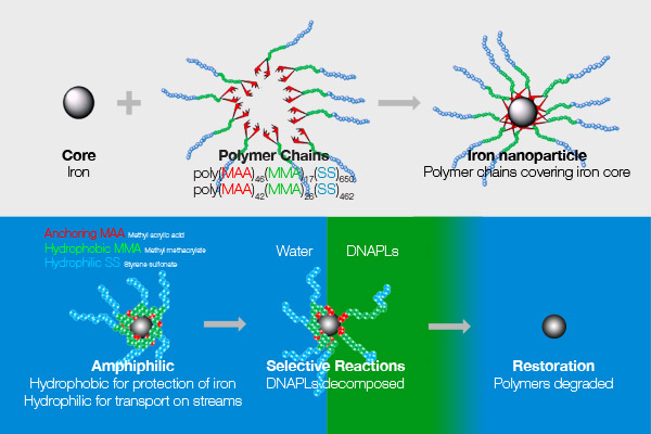 In an interdisciplinary research at Carnegie Mellon University, I synthesized polymer chains from the surface of iron nanoparticles using Atom Transfer Radical Polymerization (ATRP). The smart nanomaterials selectively react to the pollutants to degrade and neutralize them. Experiments have proved that the pollution level have been lowered significantly by the treatment. R 1 2 3